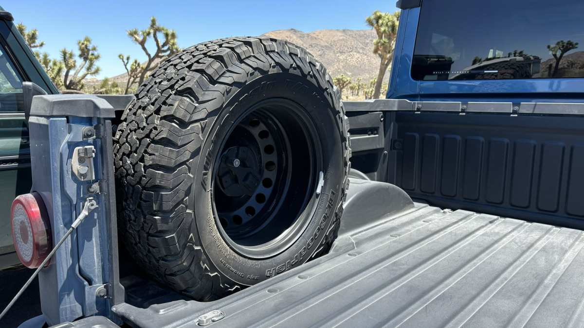 Speaking of such journeys, the Quartermaster bed has a payload capacity of 1,889 pounds, which is about 500 more than a Jeep Gladiator Rubicon, which is quite obviously the closest thing in concept to the Quartermaster (although the Jeep has a different frame than its own SUV sibling). The 61.5-inch-long bed is an inch longer than a Gladiator’s, as well as 6.9 inches wider at its greatest point (63.7 inches). Of course, a Gladiator does not have its spare tire taking up space in the bed, which the Ineos does. It’s cleverly sunk into an indentation on either side of the bed (you could stuff two spares back there if you’d like), but it takes up space nevertheless. The tailgate is also not damped, a common truck feature nowadays, meaning it just uncouthly slams down.