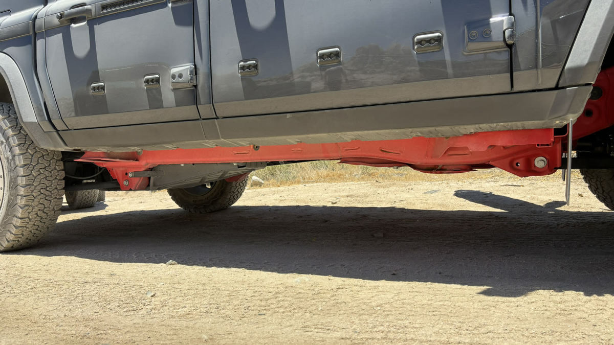 So why bother with ye olde steering? Well, we also did some mountain goating. I’ve long been trained to not wrap my thumbs around the steering wheel spoke while off-roading, as sudden kickback can, well, break them. That’s a rack-and-pinion thing. It’s far less likely to happen with recirculating ball, and indeed, our rock-crawling stints were easy-cheese from a steering perspective.
